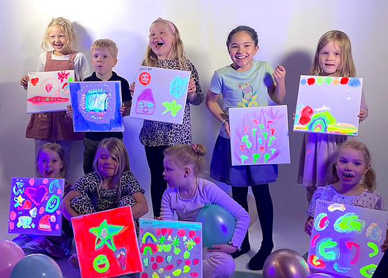 Maalataan uv-hohtavin maalein kangaspohjille. Maalaukset saa heti lähtiessä mukaan.